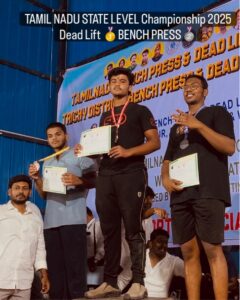 V.M Prasanna Kumar of 12 C participated in the Tamilnadu State Power lifting Championship for Men and Won I Place in Dead lift and II Place in Bench press in the Sub Junior category held at Trichy on 09.11.25 conducted by Tamilnadu Powerlifting Sports Welfare Association.